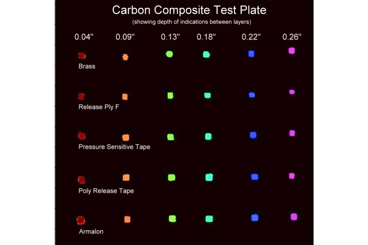 Raw Data Ultrasonic Cscan shown peeling through layers of a graphite composite test piece. The last image shows a summary of the delaminations per depth/layer into the part.