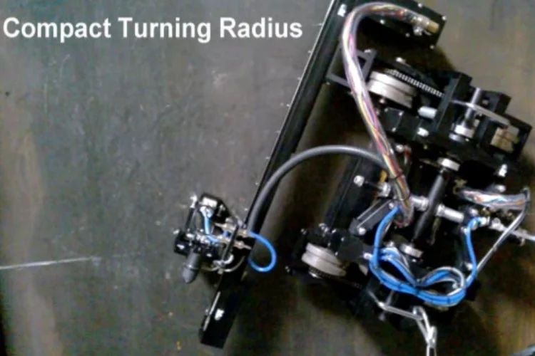 The RoboCrawler is an industrial steerable magnetic wheel crawler with a high speed raster arm.The Crawler's open frame design conforms to the scanning surface by dynamically adjusting for camber, suspension, toe in/out. These features allow the RoboCrawler extreme skid steering ability without lifting off the surface